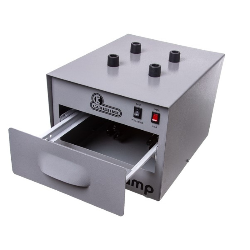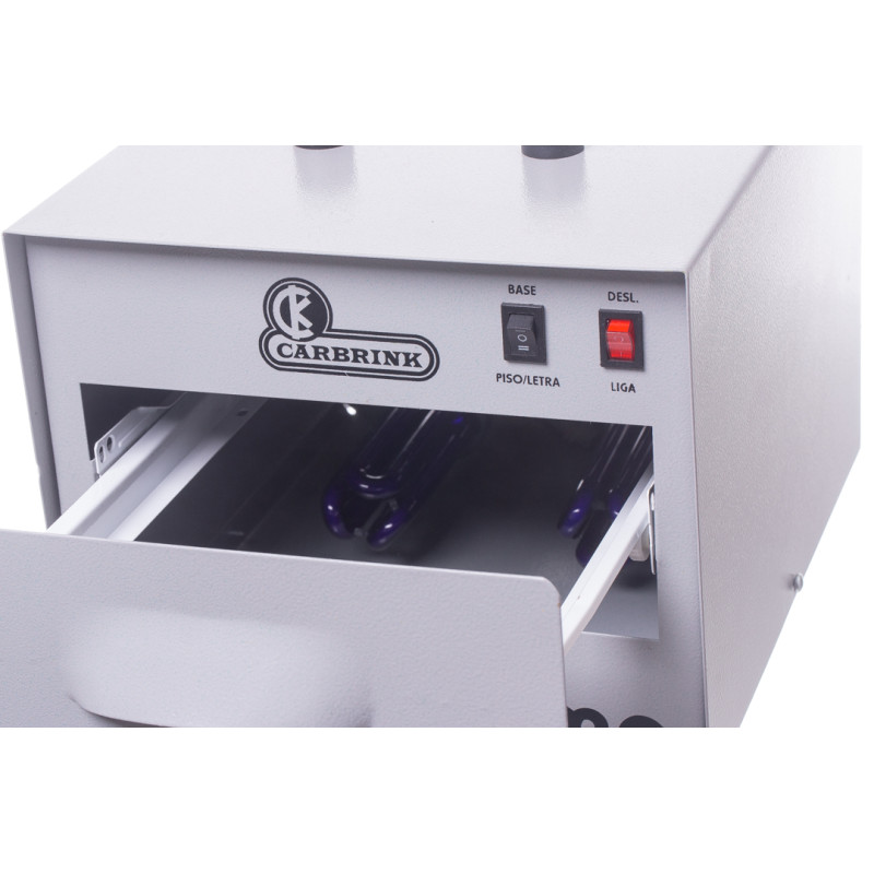 Máquina processadora de carimbos pelo sistema de fotopolímero líquido, com 4 (quatro) lâmpadas UVA de exposição dupla e estrutura construída em chapa de ferro com pintura em epóxi cinza.
